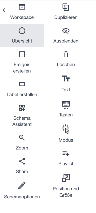 Der Schemaassistent ist eine Unterstützung, um einem Schema schnell viele Elemente hinzuzufügen. Gerade wenn Dein Schema noch leer ist, kannst Du auf diese Weise schnell und einfach Schaltflächen zum Schema hinzufügen. Wähle dazu auf der ersten Seite aus, wie viele Ereignisse und Label (nachfolgend zusammenfassend auch Marker genannt) Du brauchst. Die kleine Übersicht zeigt Dir, wie das Schema nach der Erstellung aussieht. Keine Sorge: Du kannst jederzeit weitere Schaltfläche hinzufügen oder überschüssige entfernen!