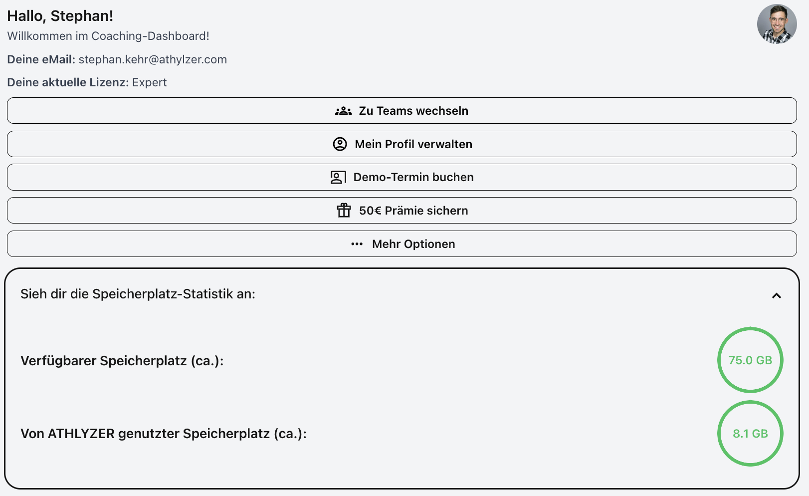 Dieser zeigt Dir an, wie viel Speicherplatz ATHLYZER auf Deinem Gerät verwendet wird. Hierbei geht es um Deinen physischen Speicher (Festplatte) des Gerätes.