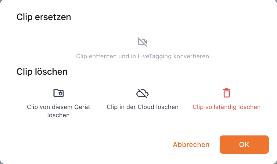 Solltest Du einen Clip in einer Analyse vollständig löschen wollen, in dem bereits Szenen getagged worden sind, kannst Du diese Analyse in ein Live-Tagging umwandeln. (Szenenliste inkl. aller Kommentare bleiben erhalten in der Analyse).